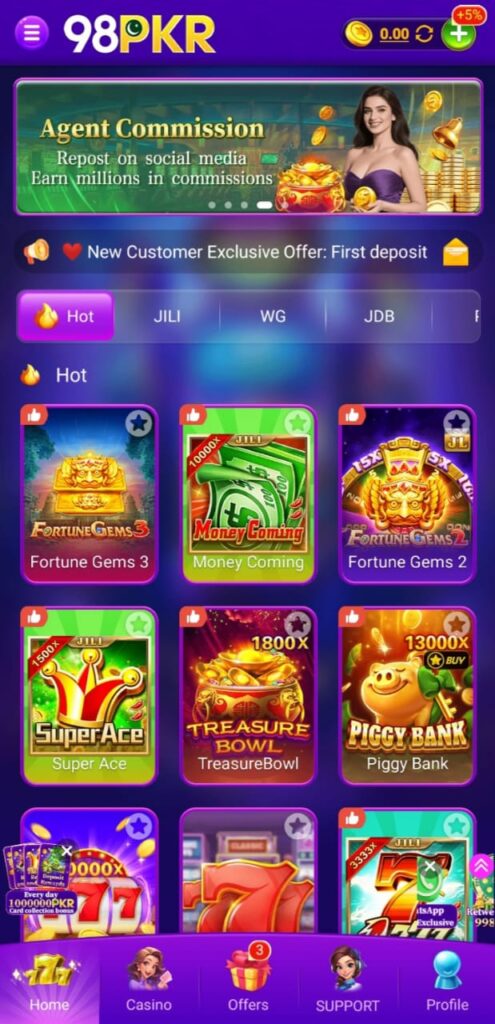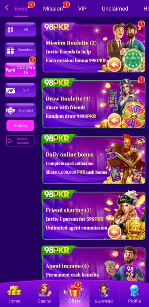 98PKR rewards players with daily login bonuses, first deposit rewards, and referral earnings.