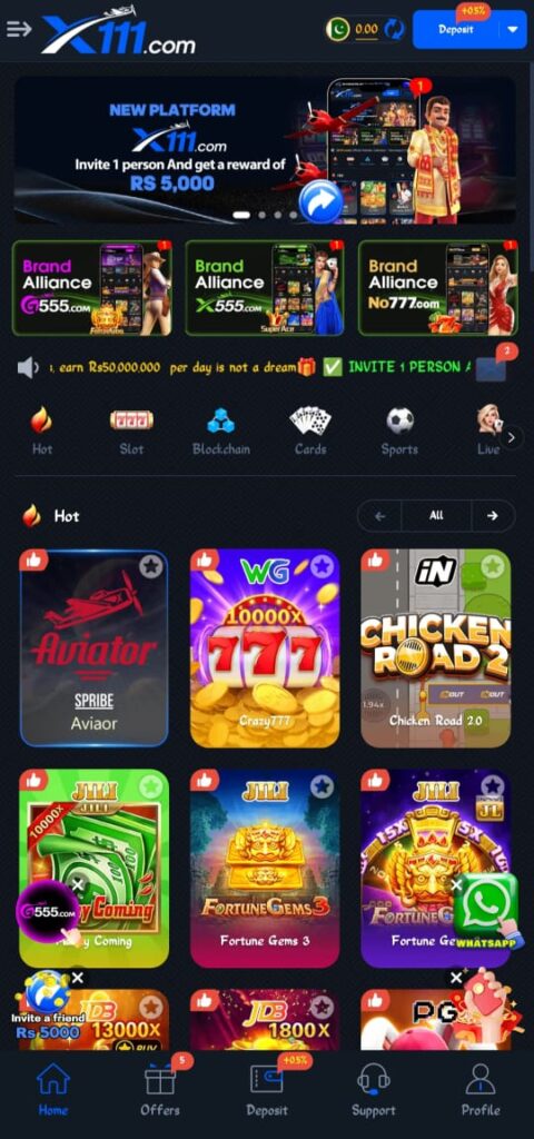 X111 Game is an online earning platform that offers a variety of games, including slot machines, card games, color prediction, and lucky spins.